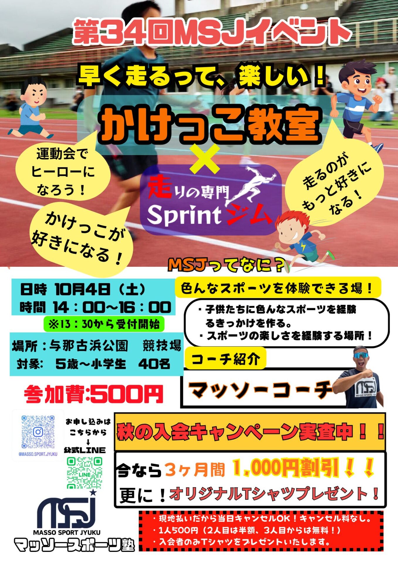 マッソーコーチが魂を込めて指導する、かけっこ教室『走る専門Sprintジム』では、秋の入会キャンペーンを実施中!!